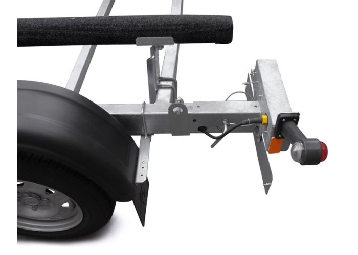 ● Усиленная оцинкованная стальная рама выполнена из замкнутого профиля, имеет большой запас прочности и позволяет уберечь жгут электропроводки от внешних повреждений по все длине прицепа. Изогнутая конструкция поперечин рамы обеспечивает максимально низкую посадку судна, что снижает центр тяжести и повышает устойчивость прицепа во время движения.